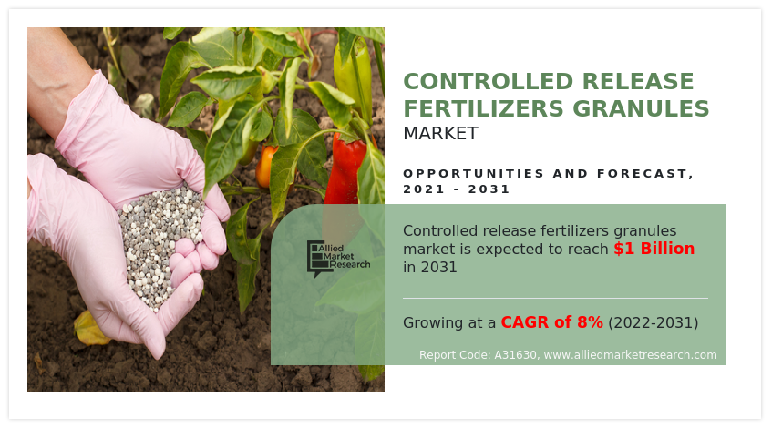 WILMINGTON, DE, UNITED STATES, October 3, 2025 /EINPresswire.com/ -- According to the report published by Allied Market Research, the global controlled release fertilizers granules market garnered $0.5 billion in 2021, and is estimated to generate $1.0 billion by 2031, manifesting a CAGR of 8.0% from 2022 to 2031. The report provides an extensive analysis of changing market dynamics, major segments, value chain, competitive scenario, and regional landscape. This research offers a valuable guidance to leading players, investors, shareholders, and startups in devising strategies for the sustainable growth and gaining competitive edge in the market.
