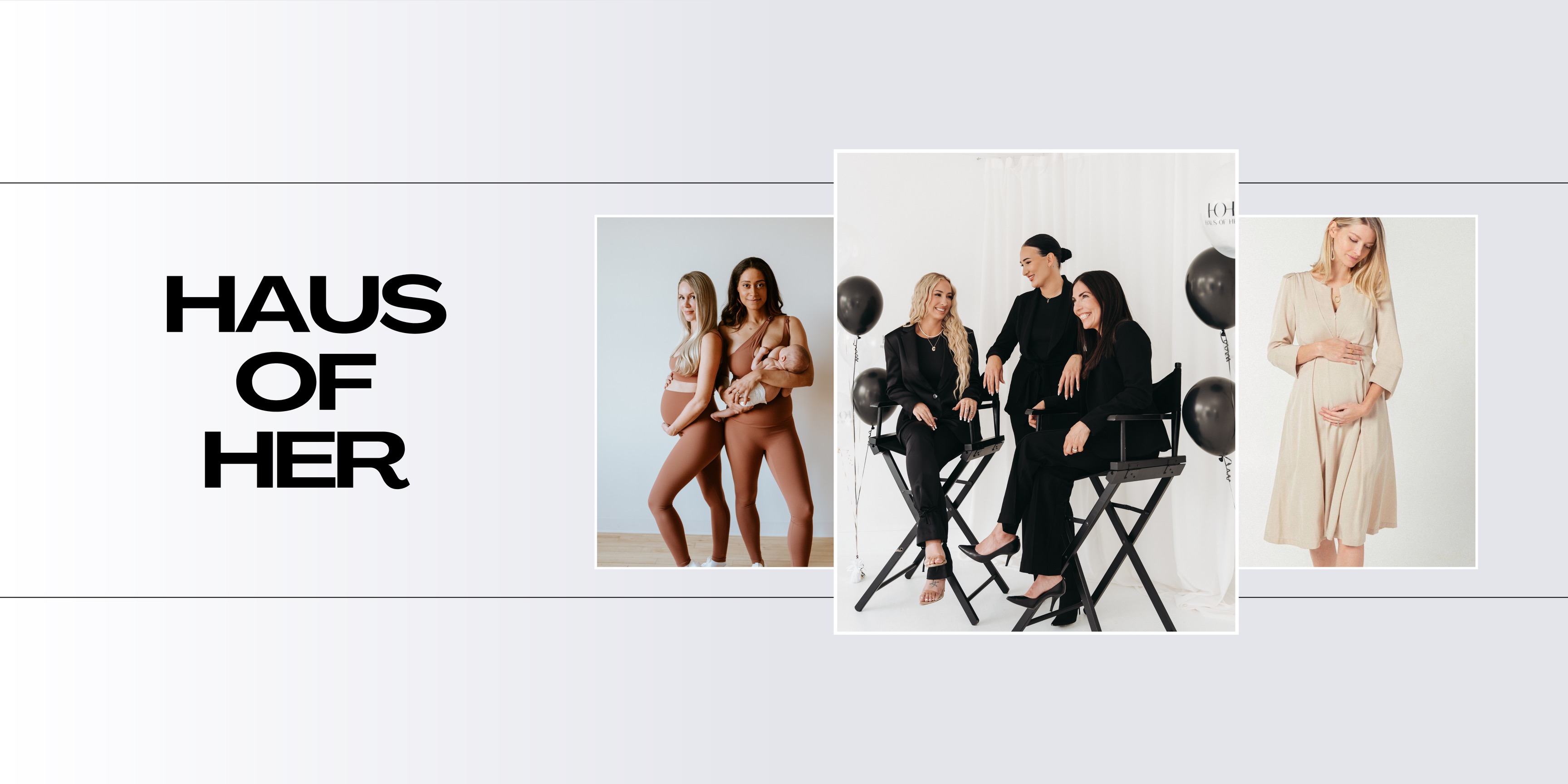 Haus of Her Group's 3 women founders pictured, along with images of their maternity activewear brand AXK, and their maternity workwear brand, MARION.