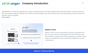 HiStranger is a pioneering Emotion AI company at the intersection of neuroscience, artificial intelligence, and storytelling. Its flagship solution, Insight Flow, quantifies emotional reactions through biosignals and facial analysis, helping creators, marketers, and studios understand how audiences truly feel.