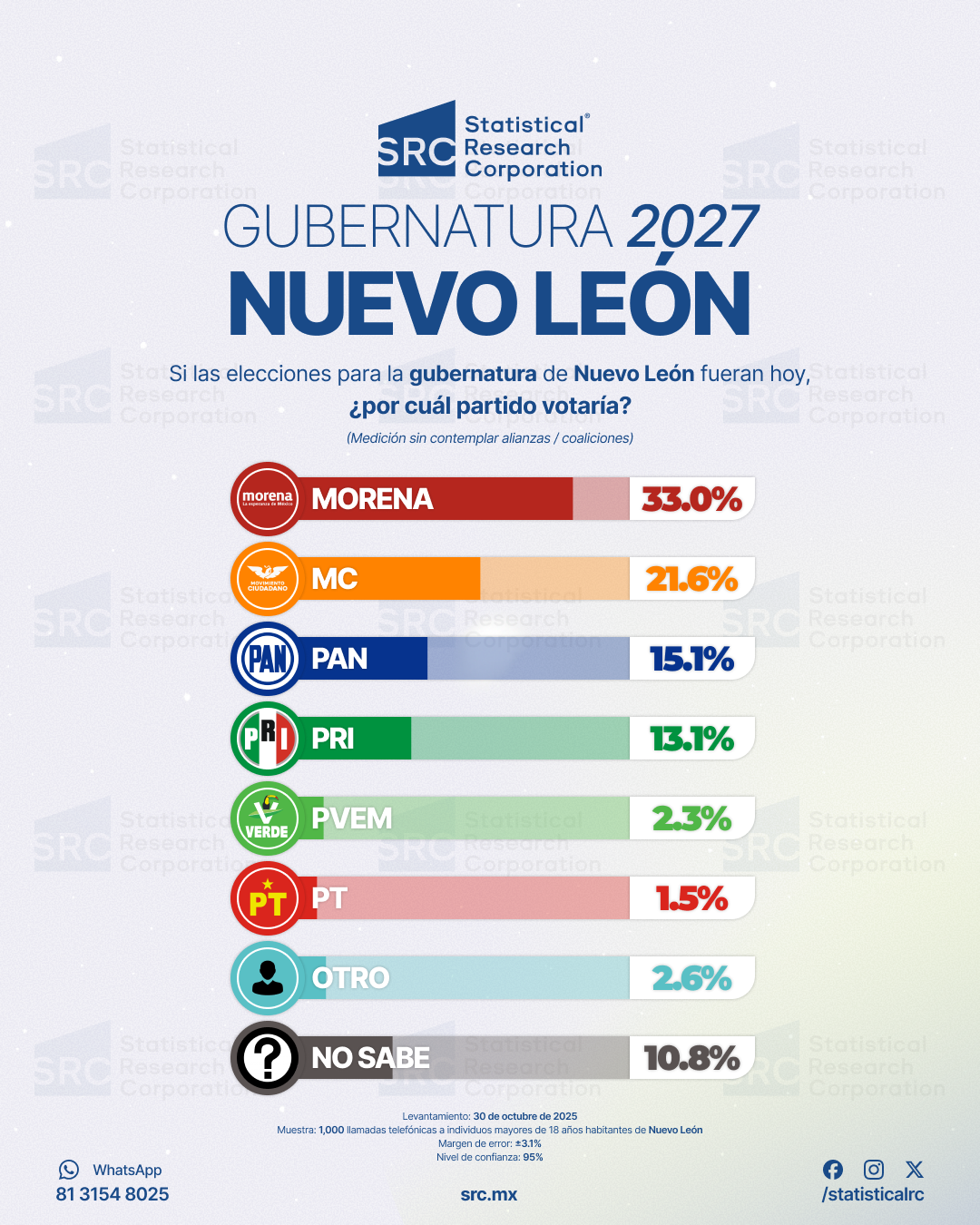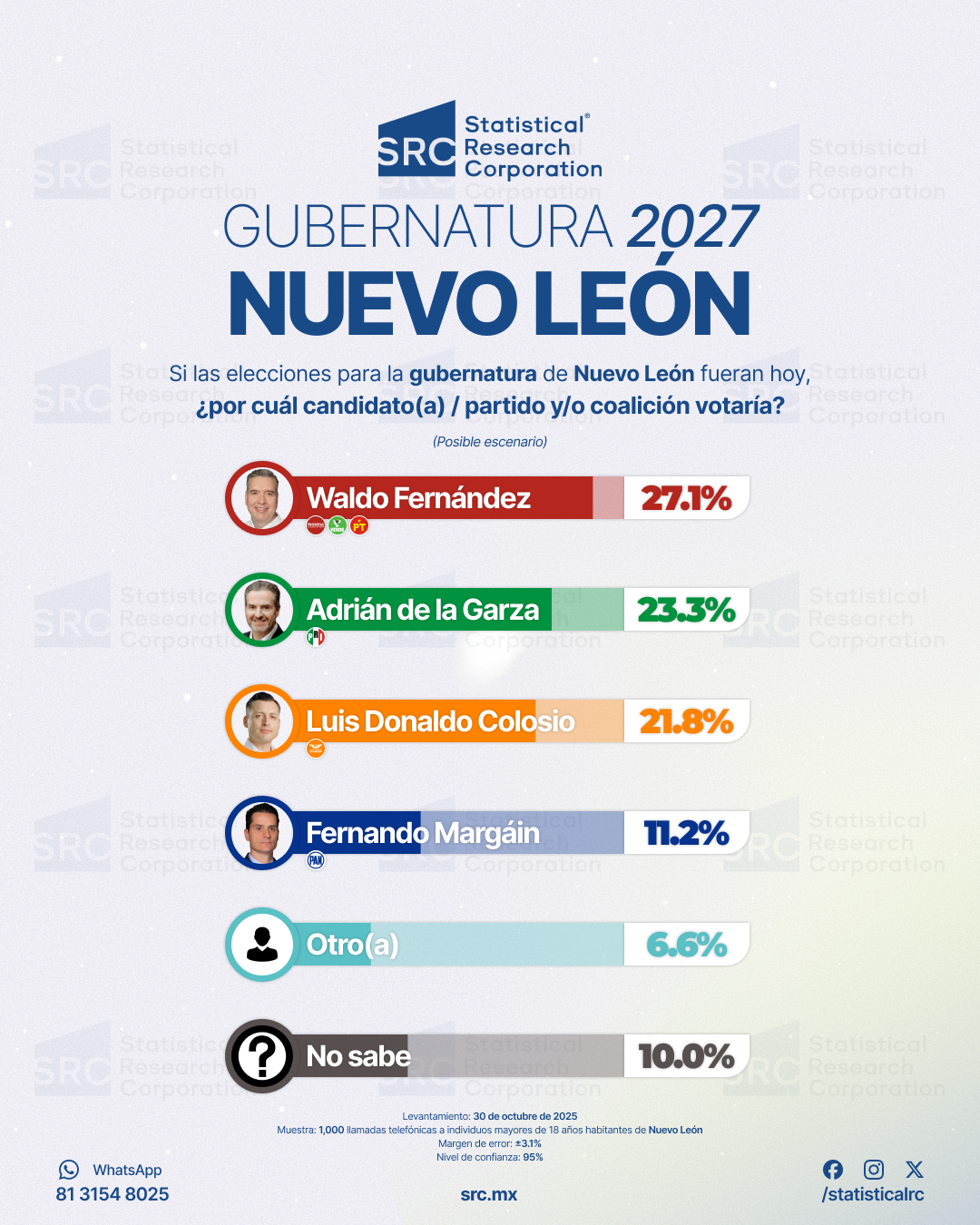 MONTERREY, NUEVO LEóN, MEXICO, November 3, 2025 /EINPresswire.com/ -- Waldo Fernández se posiciona como el candidato mejor evaluado en el escenario principal de la nueva encuesta para la gubernatura de Nuevo León 2027, con 27.1% de las preferencias. Morena lidera la intención de voto partidista con 33.0%, según el estudio realizado por la casa encuestadora Statistical Research Corporation (SRC).