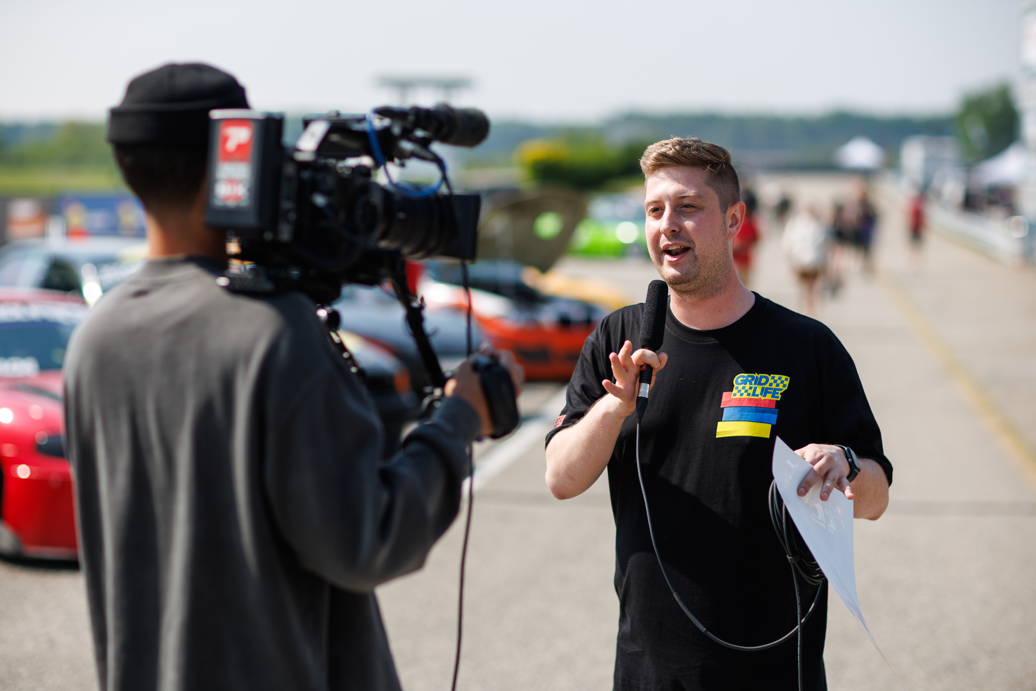 Drivers in the GRIDLIFE motorsports experience are interviewed for the live broadcast.